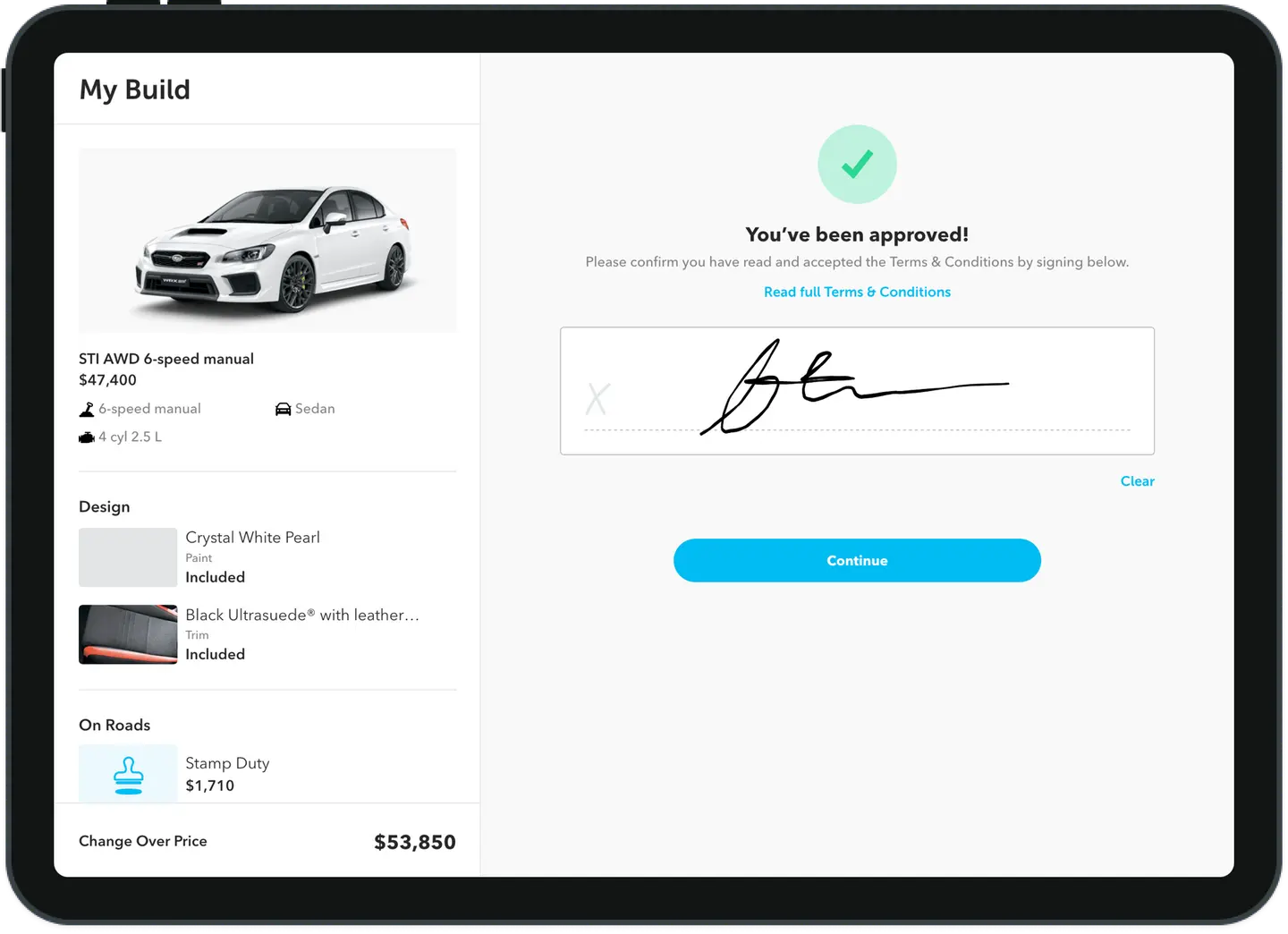 Buying a car is fun. Doing paperwork? Not so much. Help your customers enjoy the entire purchasing process by letting them sign the T&Cs digitally (while saving yourself some admin time.)